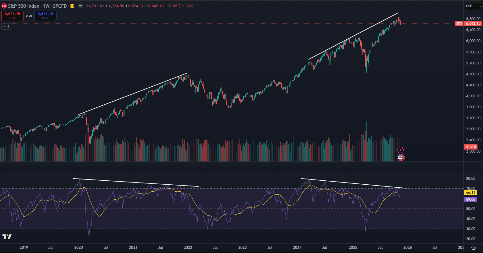 Týždenný RSI už niekoľko týždňov zobrazuje nižšie vrcholy, zatiaľ čo cena vytvára vyššie maximá. Takýto kontrast býva často časovanou bombou. Z trhu sa vytráca hybnosť, hoci graf ešte navonok pôsobí stabilne. Podobná situácia sa odohrala koncom roku 2021, keď divergencia predznamenala už len posledné krátke oživenie pred veľkým ochladením, ktoré napokon prerástlo do zostupného roka 2022.