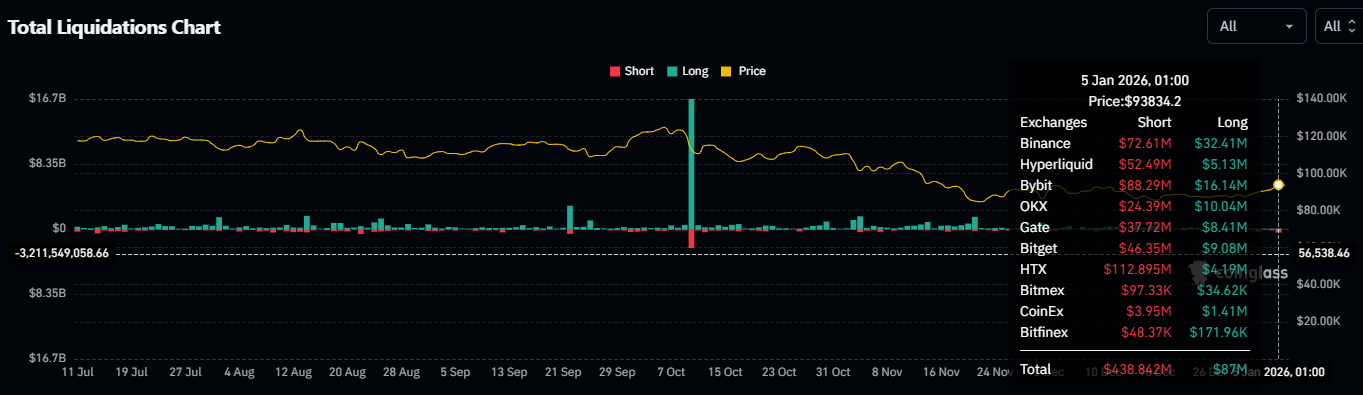 Podľa údajov CoinGlass došlo 5. januára na kryptotrhu k výraznej vlne likvidácií, ktorá odhalila silný nesúlad v očakávaniach obchodníkov. Zatiaľ čo long pozície zaznamenali likvidácie v objeme približne 87 miliónov dolárov, shortové pozície utrpeli omnoho tvrdší zásah až na úrovni 438,84 milióna dolárov. Tento nepomer jasne ukazuje, že veľká časť trhu stavila na pokles cien, ktorý sa však nenaplnil.