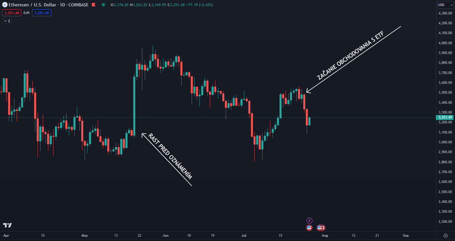 Krátkodobí špekulanti sú možno zarazení, že trhová cena Etherea nereagovala na spustenie obchodovania s ETF. Má to ale svoj dôvod. Oznámenie, že ETF pre Ethereum boli schválené, existovalo totiž už koncom mája, pričom pár dní pred rozhodnutím cena raketovo narástla za jediný deň o 20 %.