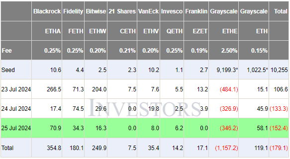 Na druhej strane, spoločnosť Grayscale opúšťajú investori z dôvodu, že ide o drahší produkt, keďže skonvertovali pôvodný ethereový trust na ETF. V prvý deň nastal odliv až 484,9 milióna dolárov. Druhým dôvodom odchodu je, že Grayscale pôvodne na všetky investície uvalila 6-mesačné obdobie blokovania. Naopak ETF je likvidnejšie.