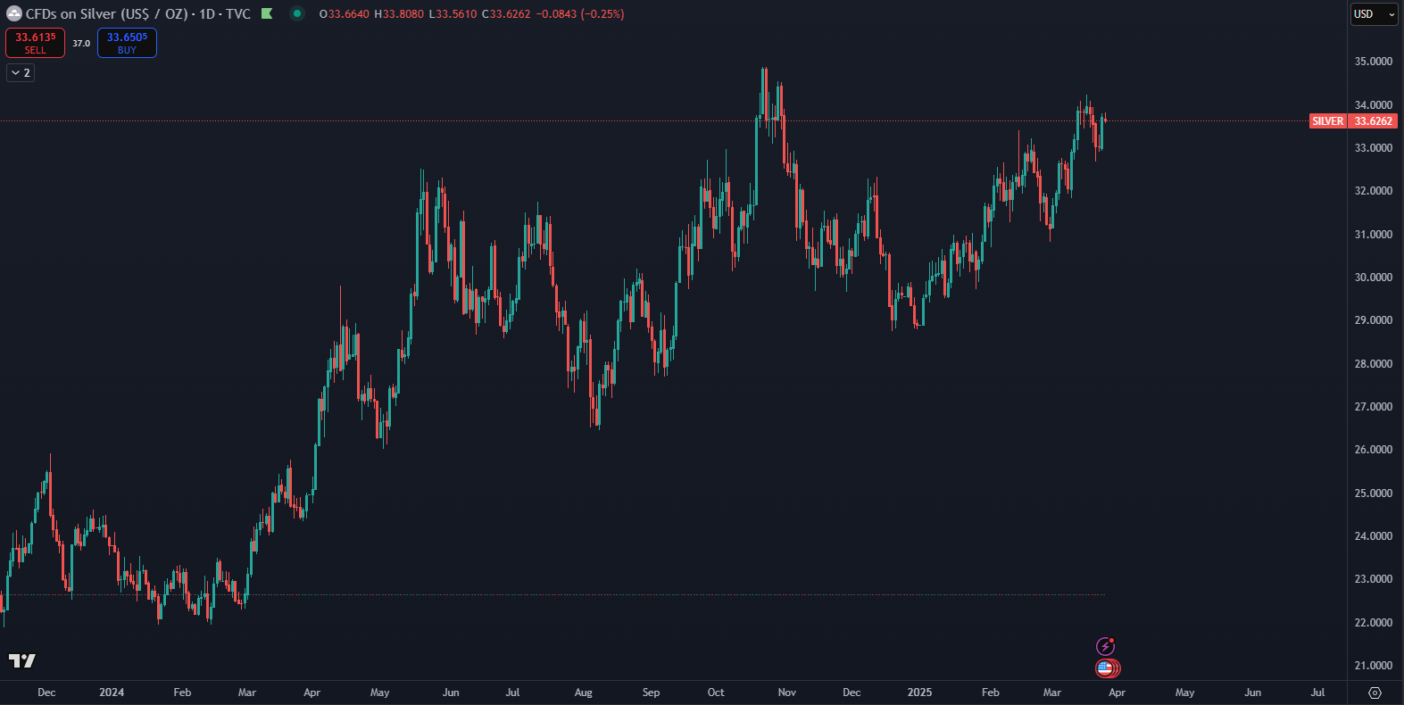 Striebro: Podobne ako zlato vykazuje stabilný rast. Napriek tomu, že jeho cena nie je taká volatilná ako cena zlata, striebro sa považuje za cenný kov s rastúcim dopytom, najmä v priemyselných odvetviach. Tento rast bol podporený nielen rastúcou cenou zlata, ale aj zvyšujúcim sa dopytom po striebre v technológiách, ako sú solárne panely a elektronika. Tento faktor zaručuje stabilitu jeho ceny, ktorá neustále rastie. V súčasnosti striebro delí iba kúsok od prekonania 13-ročného maxima.