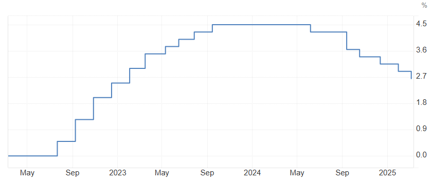 - ECB pristúpila k zníženiu úrokových sadzieb 6-krát počas rovnakého obdobia. Znížila svoju hlavnú refinančnú sadzbu z maxima 4,50 % na 2,65 %. ECB sa zameriava na znižovanie nákladov na pôžičky pre firmy a domácnosti, pričom inflácia by mala dosiahnuť 2,3 % v roku 2025 a 2 % v roku 2027. Prognózy hospodárskeho rastu boli však revidované nižšie na 0,9 % v roku 2025.