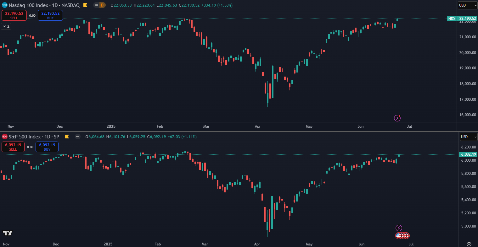 Americké akciové indexy S&P 500 a Nasdaq 100 rastú nepretržite už od začiatku apríla 2025. Trhy podporujú očakávania znižovania úrokových sadzieb, silné hospodárske výsledky firiem a postupné upokojenie geopolitickej situácie. Po oznámení prímeria medzi Izraelom a Iránom ceny akcií zrýchlili svoj rast, keďže investori zareagovali pozitívne na zmiernenie napätia na Blízkom východe.