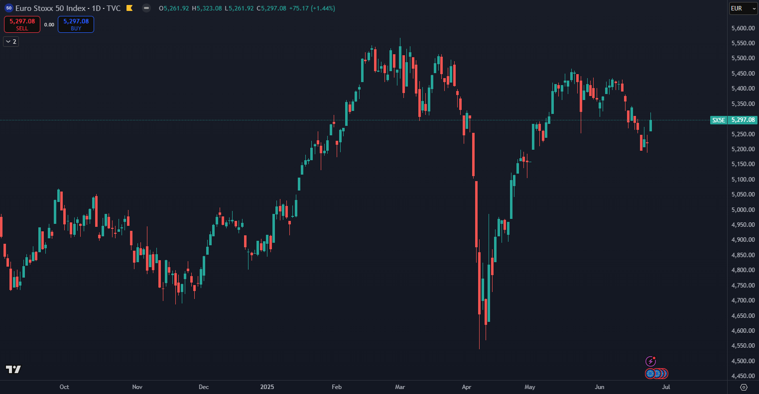 Index Euro Stoxx 50 sa aktuálne obchoduje na úrovni 5 297 bodov, čo predstavuje pokles o 5,15 % oproti historickému maximu na úrovni 5 568 bodov. Napriek tomu pretrváva pozitívna nálada, najmä vďaka výhľadu na stabilizáciu menovej politiky a postupné zlepšovanie ekonomických ukazovateľov v kľúčových krajinách ako Nemecko a Francúzsko.
