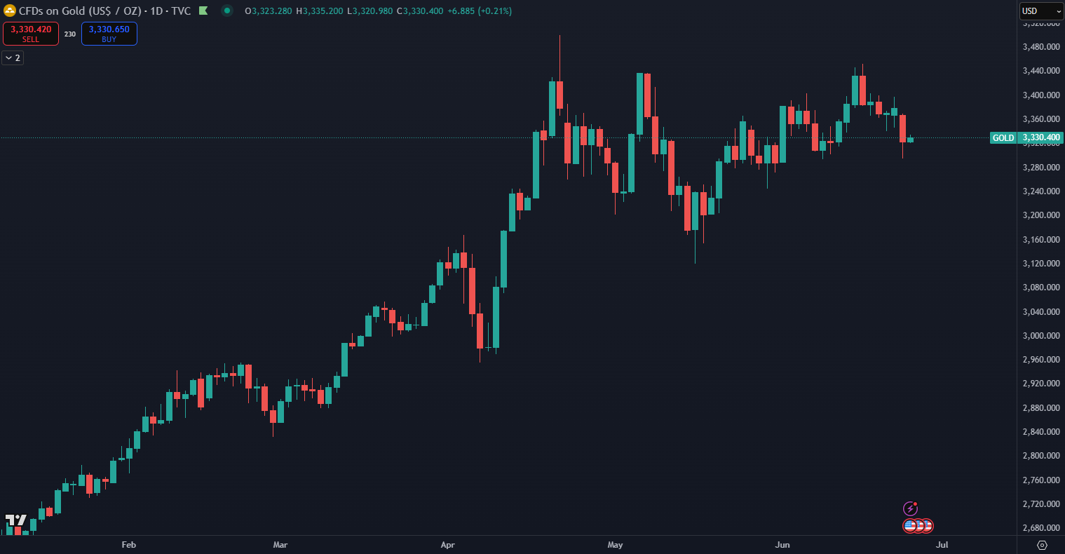 Zlato pokračuje v raste a obchoduje sa blízko historického maxima na úrovni 3 331 dolárov za uncu, pričom rekordná hodnota je 3 500 dolárov. Rast ceny zlata je spôsobený najmä geopolitickou neistotou po konflikte na Blízkom východe, ktorý zvýšil dopyt po bezpečných aktívach. Investori v čase neistoty vyhľadávajú zlato ako ochranu proti riziku a inflácii.