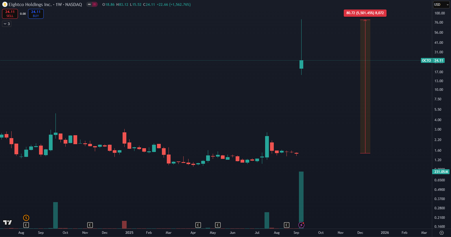 Akcie spoločnosti Eightco Holdings (NASDAQ: OCTO) zažili jeden z najextrémnejších nárastov na Wall Street, keď 8. septembra vzrástli o viac než 5 500 % počas jedného obchodného dňa, podľa magazínu Finbold.