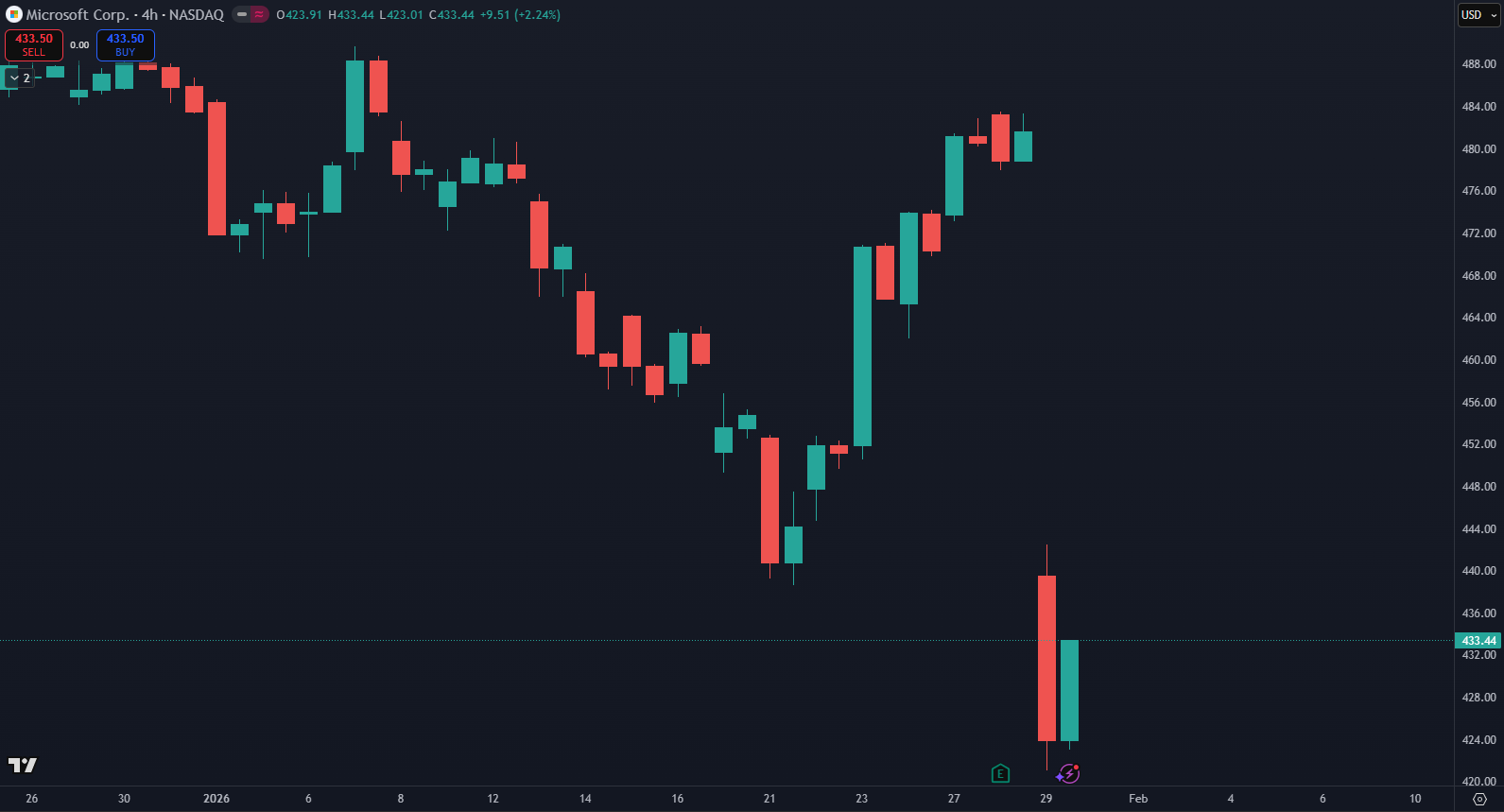 Pád akcií Microsoft. Zdroj: tradingview.com