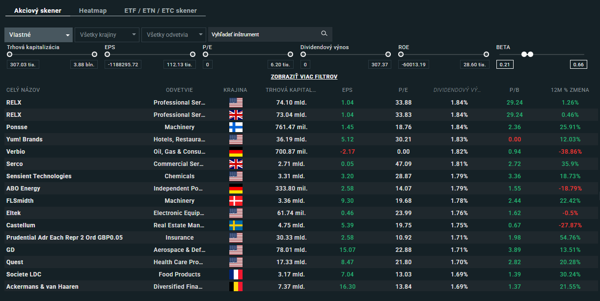 - Výber konkrétnych dividendových akcií a ETF fondov sledujúcich túto triedu aktív.