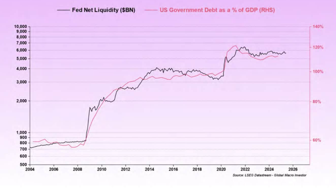Druhý graf prezentuje koreláciu medzi dlhom USA a čistou likviditou Fedu. Keď dlh presiahne 100 % HDP, ekonomický rast nestačí na splácanie úrokov, čo núti štát k tlačeniu peňazí a tým k znehodnocovaniu meny.