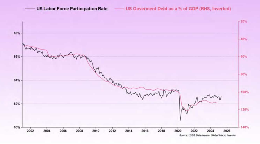 Pal, zakladateľ Global Macro Investor a Real Vision, poukazuje na dva dôležité makroekonomické grafy. Prvý ukazuje pokles účasti pracovnej sily a zároveň prudký nárast vládneho dlhu od roku 2002, ktorý sa po kríze v roku 2008 a v roku 2020 ešte viac zrýchlil. Podľa Pala demografia je kľúčovým faktorom dlhu – staršia populácia produkuje menej a zároveň si vyžaduje viac výdavkov zo strany štátu.
