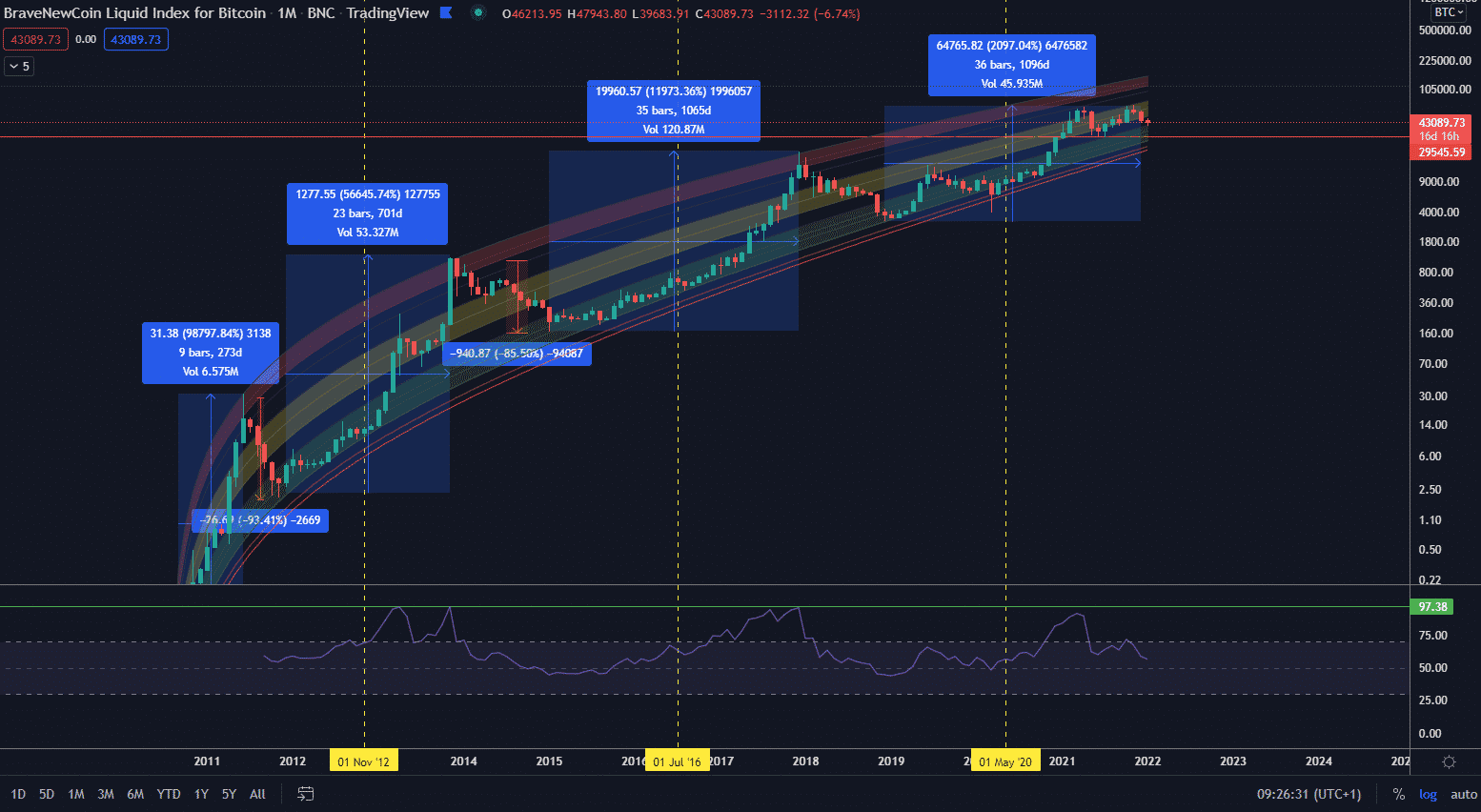 Obrázok nižšie poukazuje na dlhodobý rastúci logaritmický trend Bitcoinu. Ako vidíme, z dlhodobého hľadiska sú všetky lokálne minimá rastúce. Červená zóna predstavuje prekúpenú dlhodobú zónu rezistencie a používa sa na odhad maxím cyklov. V súčasnosti je cena v neutrálnej zóne.