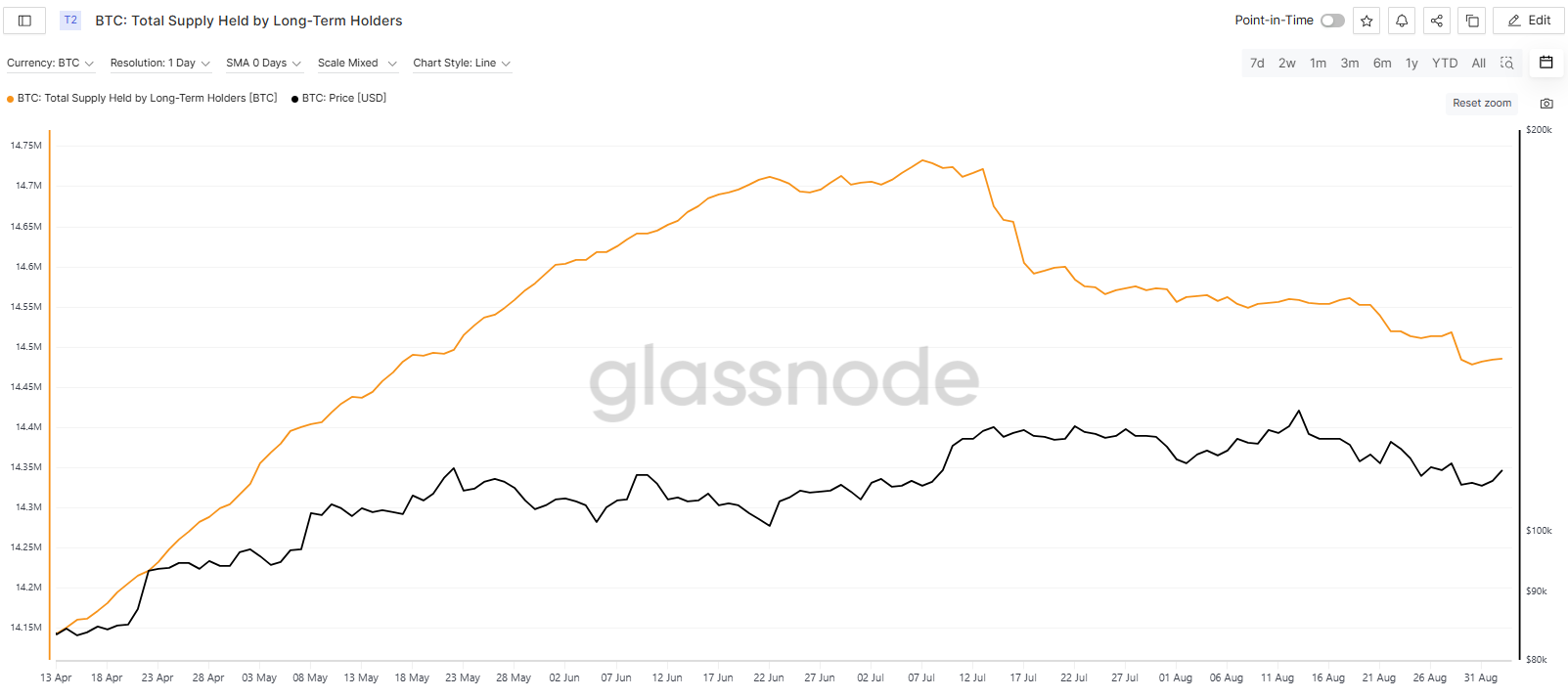 Výsledkom tohto správania je, že podľa údajov Glassnode držby dlhodobých držiteľov klesajú už od začiatku júla. Z pôvodného maxima 14,73 milióna mincí sa objem znížil na 14,48 milióna. To znamená, že dlhodobí investori sa zbavili približne 250 000 BTC len počas dvoch mesiacov, čo vytvára tlak na trh. Len pre predstavu, celková ponuka mincí je v súčasnosti podľa CoinMarketCap na úrovni 19,91 milióna.