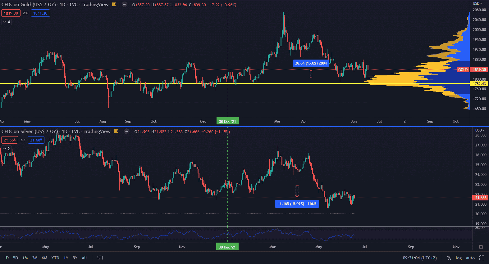 Graf dole ukazuje ceny zlata a striebra. Zlato od januára narástlo mierne o 1,60 %, pričom striebro stratilo približne 5 % svojej hodnoty, čo je stále hlboko pod infláciou. Uchovávateľ hodnoty vo forme drahého kovu sa v inflačných časoch opäť osvedčil. Napriek tomu, kým drahé kovy nenarastú aspoň o infláciu, ich reálna hodnota klesá. Avšak v súčasnosti je to jedna z najlepších volieb, ako minimalizovať straty spôsobené globálnou recesiou.