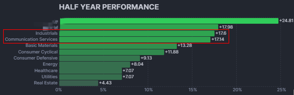 Na treťom mieste je sektor priemyslu a komunikačných služieb. Obe dosiahli za posledných 6 mesiacov približne rovnakú výkonnosť. Zatiaľ čo priemysel za toto obdobie narástol o 17,6 %, komunikačné služby o 17,14 %. V rámci tejto skupiny existuje mnoho známych spoločností.