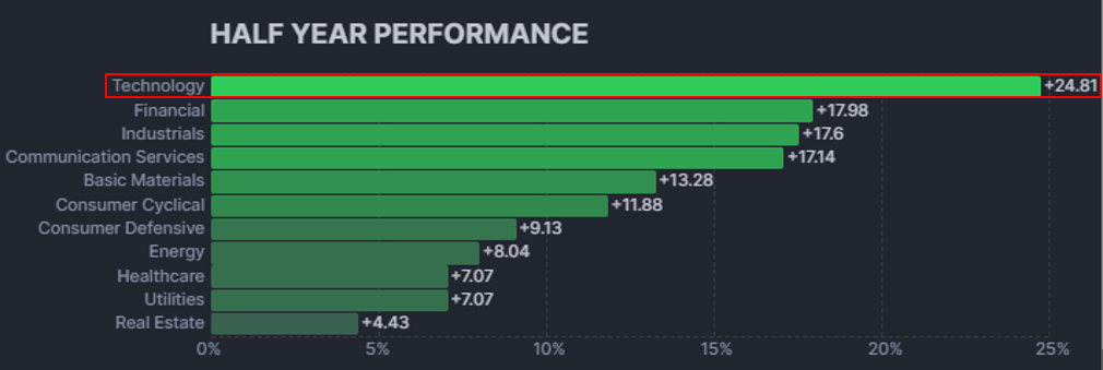 Asi nikoho neprekvapí, že najziskovejší bol za posledné obdobie sektor technológií, ktorý stúpol za posledný polrok o 24,81 %. Technologický sektor tvoria podniky, ktoré predávajú tovary a služby v oblasti elektroniky, softvéru, počítačov, umelej inteligencie a iných odvetví súvisiacich s informačnými technológiami (IT).