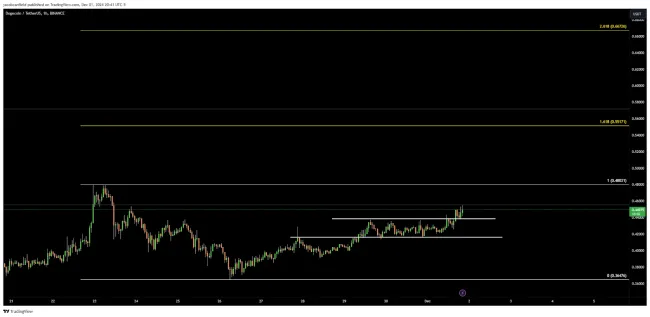 Momentálne je Dogecoin ocenený na 0,4359 dolárov s celkovou trhovou hodnotou 64,11 miliárd dolárov. Za jeden mesiac minca vzrástla o 110,8 %. Súčasná cena Dogecoinu vykazuje silnú podporu na úrovni 0,2156 dolárov. Prvá veľká prekážka je na úrovni 0,5536 dolárov, s dodatočným odporom na 0,6859 dolárov a 1,0240 dolárov. 10-dňový kĺzavý priemer je 0,4222 dolárov, čo naznačuje pozitívny trend pre Dogecoin.