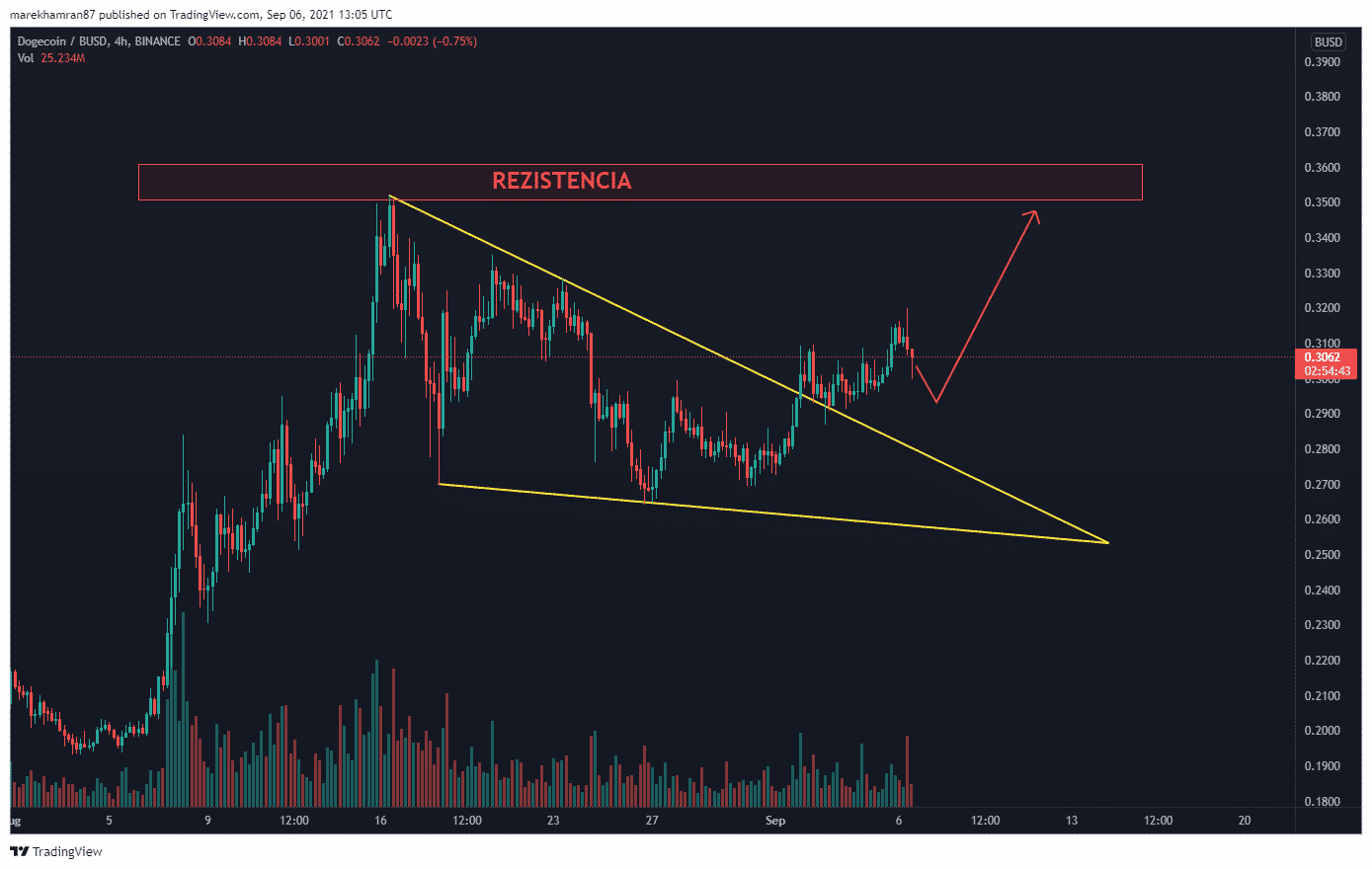 Na 4-hodinovom grafe DOGE/BUSD sa vytvoril tzv. obrazec klesajúceho klina, ktorého prelomenie môže značiť nový rastúci trend.