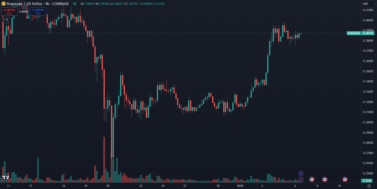 • Cena Dogecoinu vzrástla v januári 2025 na 0,3917 dolárov.