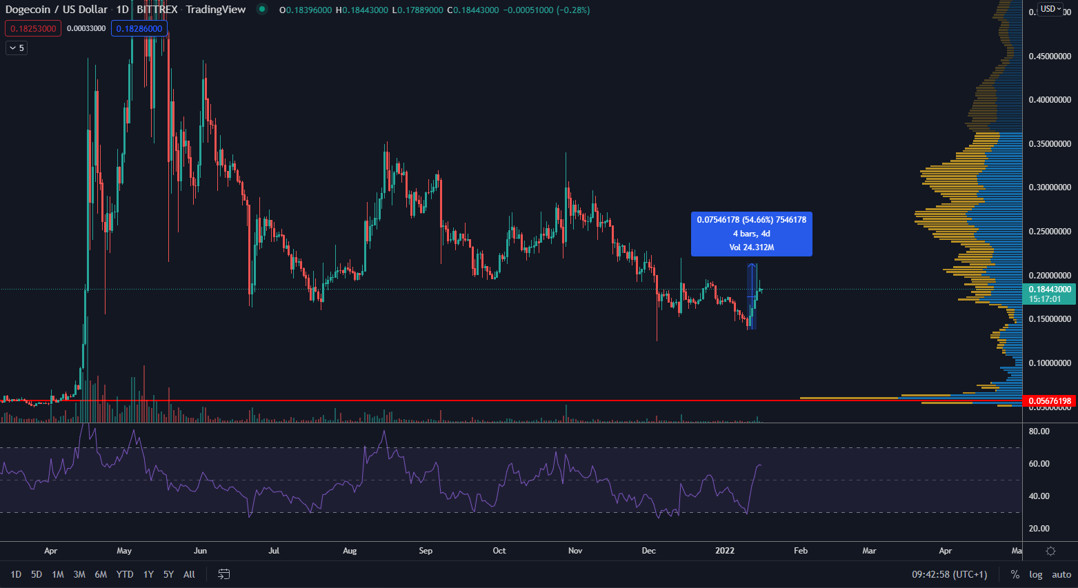Cena DOGE vzrástla 14. januára o viac ako 25 %. Celkovo za 4 dni cena vzrástla o 55 %. Za posledné dva dni však cena spätne klesla na hladinu 0,184 v čase písania článku.