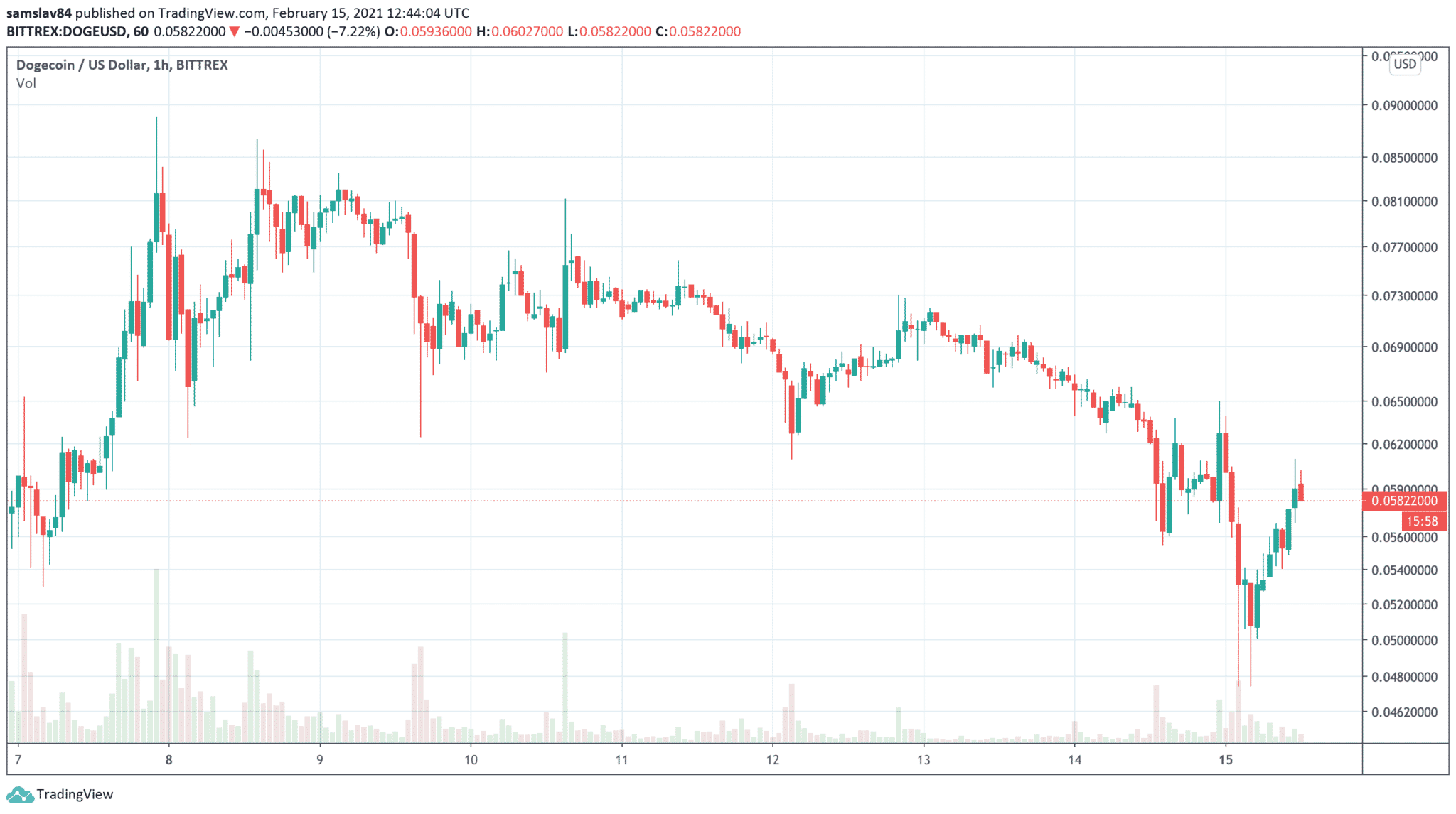 DOGE po Elonových tweetoch v priebehu niekoľkých hodín padol z 0,063 až na 0,047 dolárov, no následne cena tejto kryptomeny opäť začala rásť a momentálne je už o celý jeden cent vyššie.