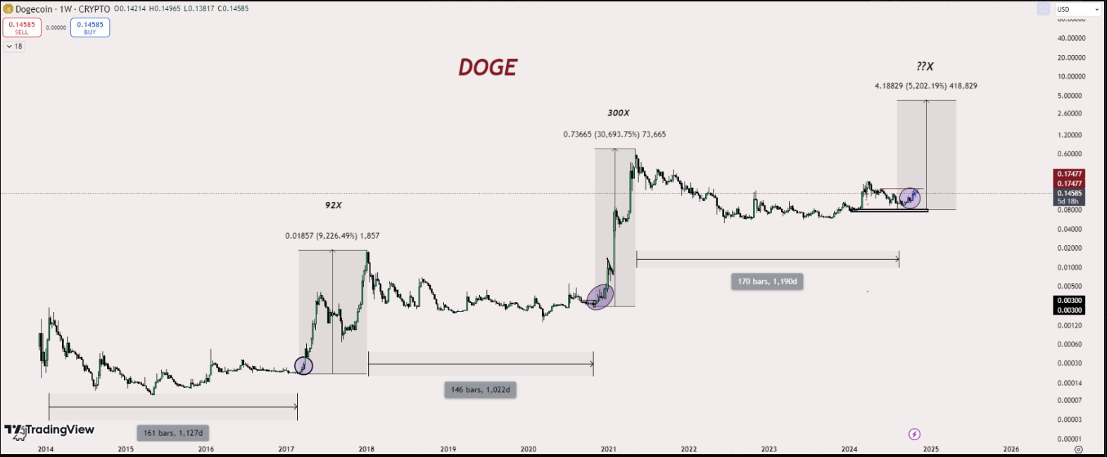 Podľa informácií CryptoGlobe magazínu analytik predpovedá dramatický nárast ceny populárnej meme kryptomeny Dogecoin. Analytik vystupujúci pod pseudonymom Zer0 na sociálnej platforme X naznačuje, že DOGE je pripravený na potenciálny nárast o 5 220 %. Tento odvážny odhad prichádza v čase, keď kryptomenový trh zažíva významné oživenie.
