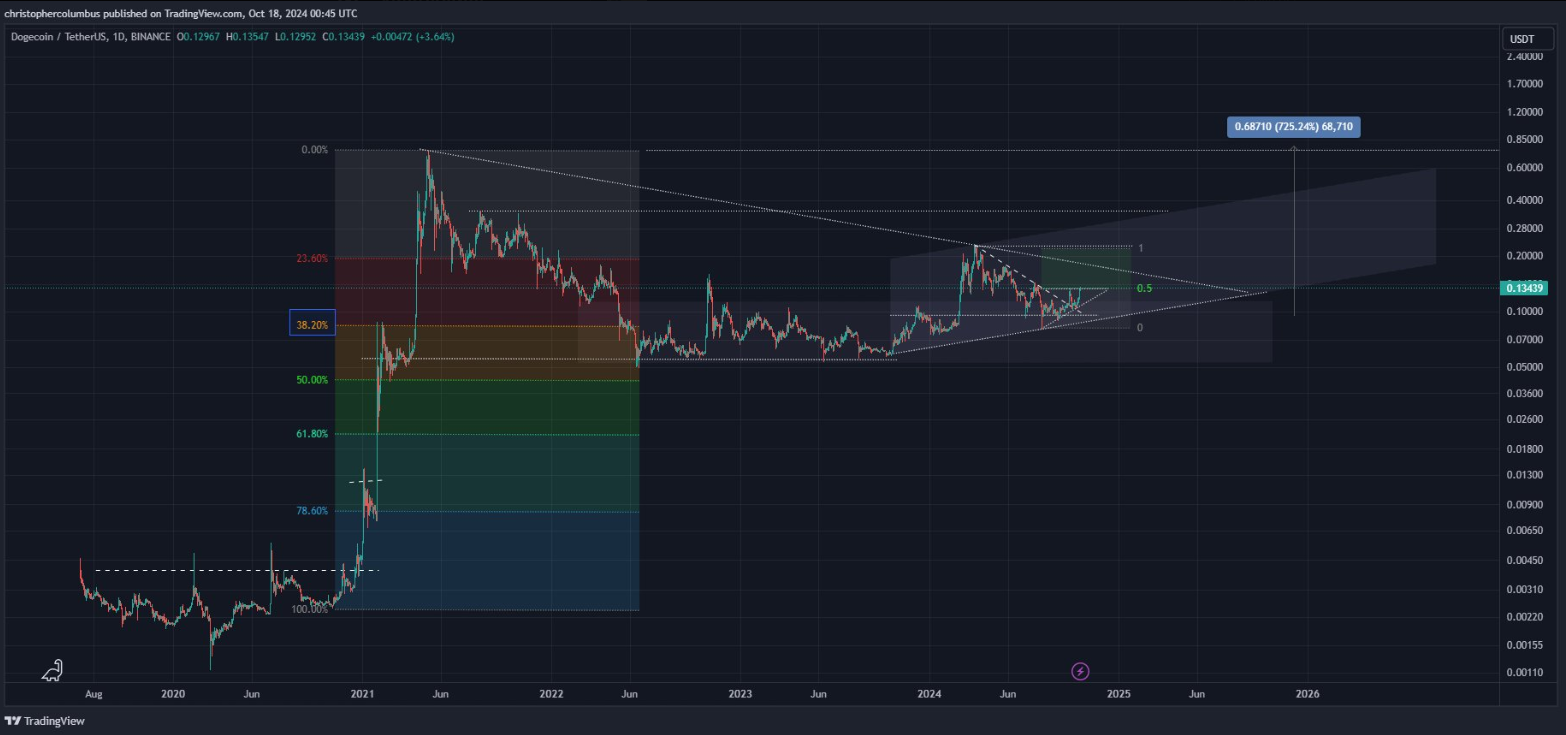 Ďalší uznávaný analytik, známy pod menom Dave the Wave, ktorý správne predpovedal pád Bitcoinu v máji 2021, poukazuje na formujúci sa vzostupný trojuholníkový pattern v dennom grafe Dogecoinu. Jeho analýzy sa v minulosti ukázali ako mimoriadne presné, čo dodáva jeho súčasným predpovediam značnú váhu.