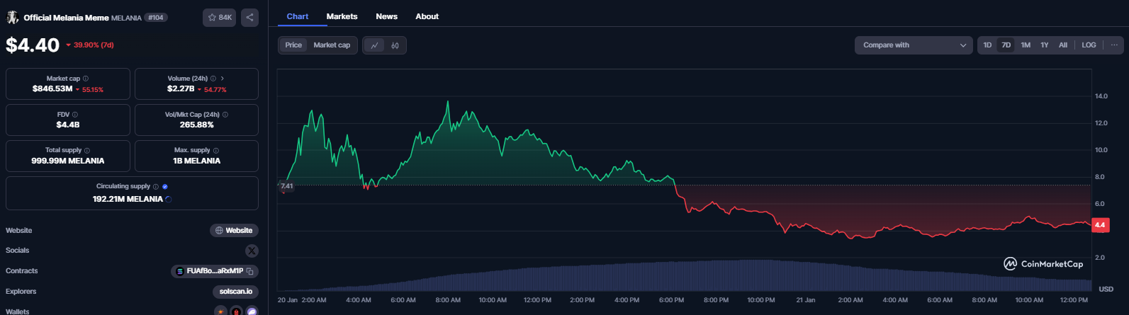 Situácia sa javí ešte kritickejšia pre token MELANIA, ktorý sa prepadol o ohromujúcich 54 % za 24 hodín. V súčasnosti sa jeho hodnota nachádza 72 % pod svojím historickým maximom 13,64 dolárov. Analytici pripisujú tento masívny pokles najmä skutočnosti, že Donald Trump vo svojom nedávnom prejave nevenoval pozornosť kryptomenám.