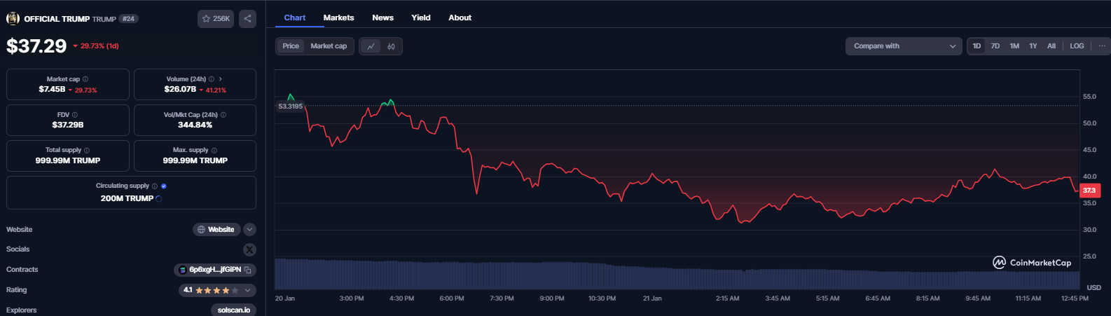 - TRUMP token stratil 6 miliárd za 24 hodín pri 30 % poklese hodnoty.