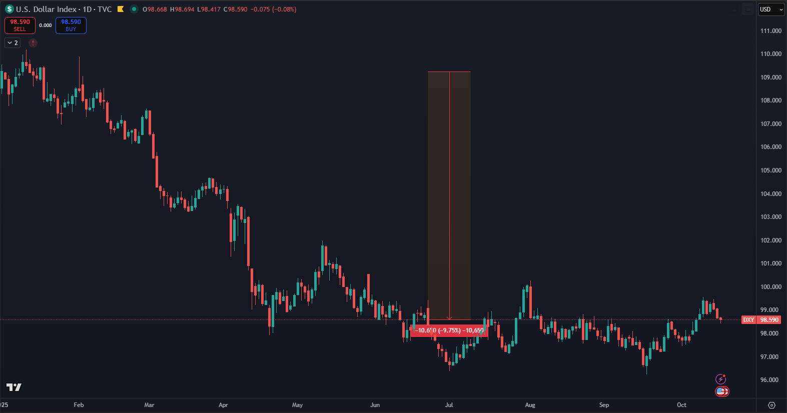 Podľa údajov TradingView dolarový index DXY v roku 2025 klesol o 10 %, čo patrí medzi najhoršie roky v histórii americkej meny. DXY index meria hodnotu amerického dolára voči košu šiestich hlavných svetových mien – euru, jenu, libry, kanadskému doláru, švédskej korune a švajčiarskemu franku. Pokles indexu znamená oslabenie dolára a zvyšuje záujem investorov o alternatívne aktíva, napríklad zlato či striebro.