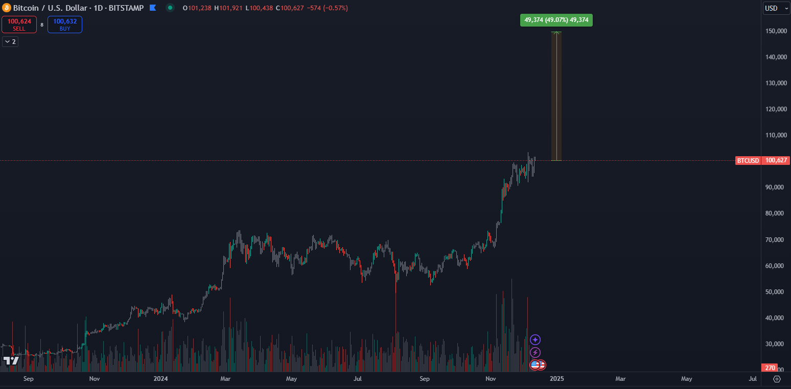 Bitcoin by musel stúpnuť o ďalších 49 % na to, aby dosiahol hranicu 150 000 dolárov. V čase písania sa BTC obchoduje na trhovej cene 100 626 dolárov, čo je tesne pod historickým maximom.