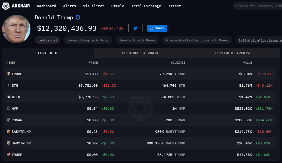 Aké kryptomeny vlastní Donald Trump. Zdroj: Arkham