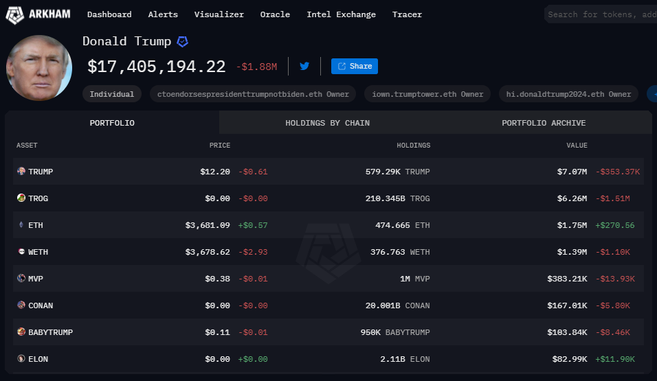 Sám Trump vlastní podľa údajov Arkham kryptomenové portfólio, ktoré dosahuje v čase písania hodnotu viac ako 17 miliónov dolárov. Len koncom mája jeho portfólio presiahlo 10 miliónov a rýchlo rastie. Najnovšie totiž do portfólia pribudol meme coin Trog s hodnotou 6,26 milióna dolárov.