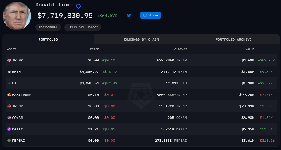 Málokto vie, že dokonca aj Trump má svoje kryptomenové portfólio. Na základe údajov Arkham môžeme vidieť, že portfólio kryptomien Donalda Trumpa prekonalo hranicu 7,7 milióna dolárov. Najväčšiu časť portfólia tvorí token TRUMP v hodnote 4,69 milióna dolárov. Nasleduje WETH v hodnote 1,50 milióna dolárov a ETH v hodnote 1,38 milióna dolárov.