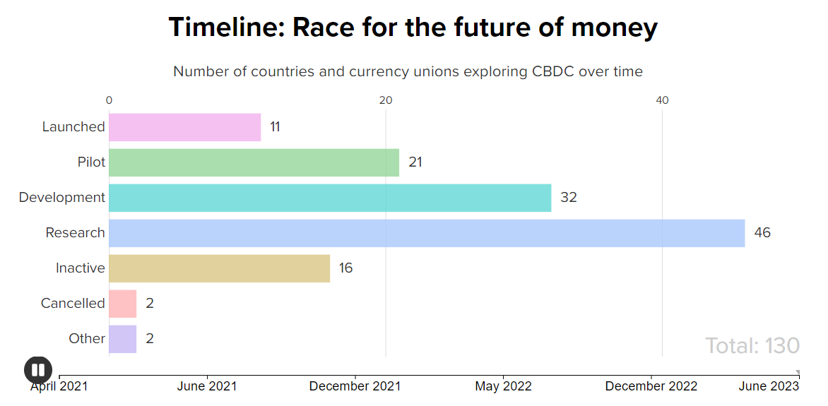 Štatistiky Atlanticcouncil ukazujú, že v súčasnosti skúma zavádzanie digitálnej meny centrálnej banky až 130 krajín. Pre porovnanie, pred troma rokmi sa o to snažilo iba 35 krajín. Práve Čína začala s výskumom ako prvá a platby akceptujú už milióny občanov. Rovnaký scenár ale čaká aj Európsku úniu. To, v akej fáze sa tento výskum u nás nachádza, sa môžete dočítať v článku Už sa to začalo. Hotovosť čoskoro zmizne a nahradia ju digitálne peniaze.