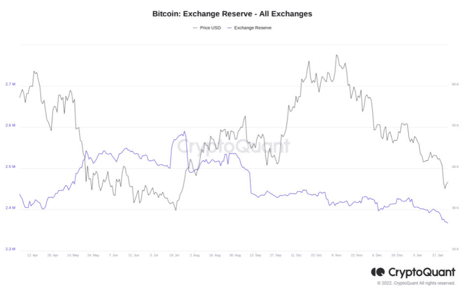 Medzi 7. decembrom a 28. decembrom 2021 sa rezervy Bitcoinu 21 hlavných platforiem monitorovaných CryptoQuant zvýšili z 2,396 milióna na 2,428 milióna mincí. Potom sa obnovil dlhodobejší klesajúci trend a od pondelka bola bilancia búrz na úrovni 2,366 milióna BTC.
