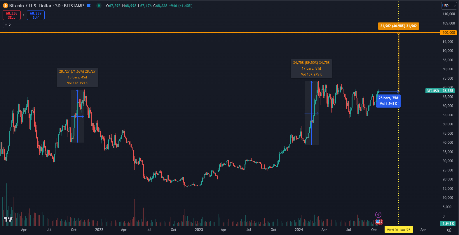 V čase písania nás do konca roka delí približne 70 dní. Za toto obdobie by musel Bitcoin narásť o 47 %, aby dosiahol cenovú úroveň 100 000 dolárov. Ak sa pýtate, či je to reálne, stačí nám niekoľko porovnaní. Nie je to tak dávno, keď Bitcoin dokázal v prvom kvartáli tohto roku len za 50 dní narásť až o 89 %. Pred troma rokmi na jeseň dokonca stúpol za 45 dní o 72 %.
