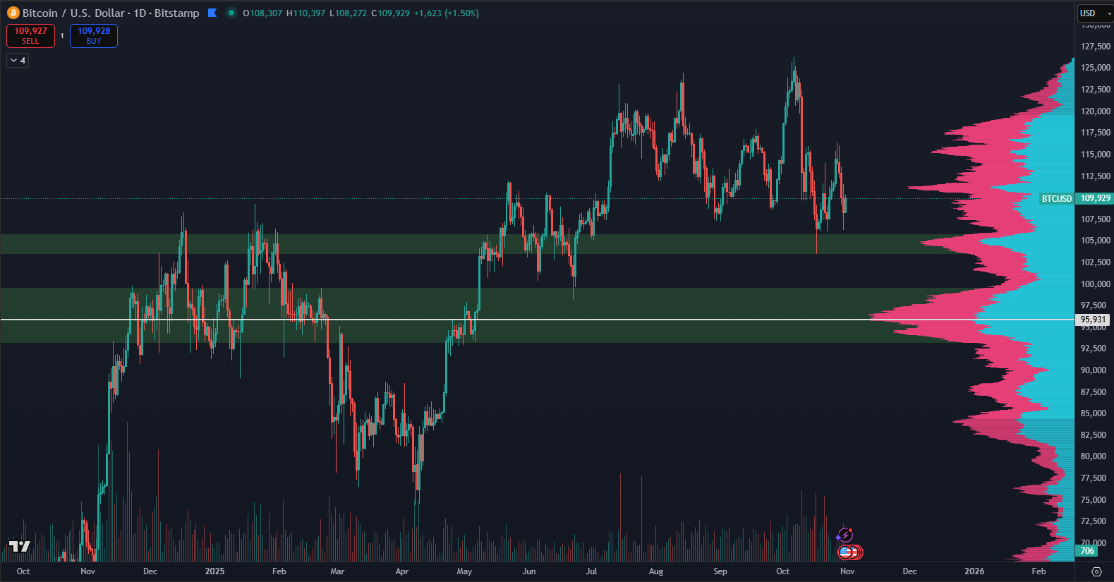 Bitcoin sa momentálne obchoduje okolo 110 000 dolárov, ukazujú údaje TradingView. Cena sa drží pod historickým maximom 126 200 dolárov, ktoré bolo dosiahnuté v prvom októbrovom týždni. Odvtedy trh prechádza korekciou, ktorá trvá už takmer celý mesiac.