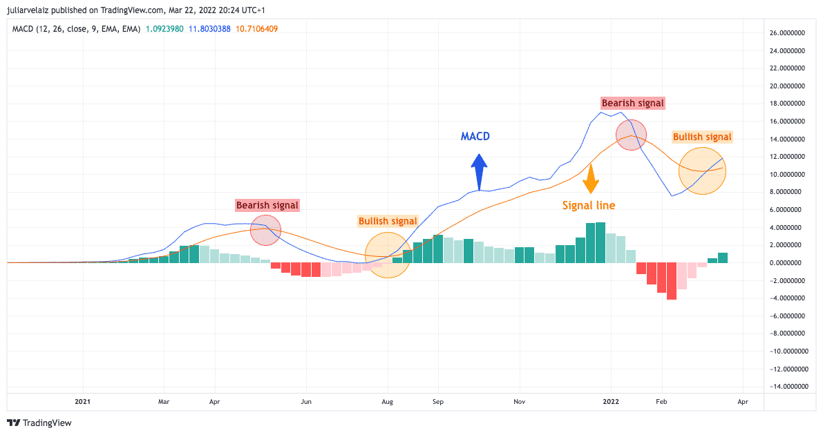 Tento indikátor vykazuje býčí signál vtedy, keď modrá čiara na grafe stúpne nad signálnu žltú čiaru. Opačný crossover by, samozrejme, znamenal prítomnosť medveďov.