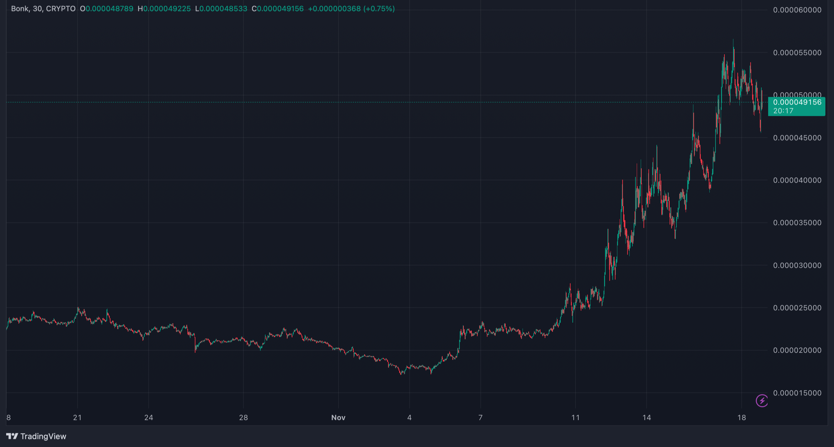 BONK je nový memecoin na blockchaine Solana s roztomilým maskotom Shiba Inu. Bol vytvorený na posilnenie komunity Solana presunutím vplyvu od veľkých venture kapitálových tokenov. Po uvedení na Coinbase hodnota BONK vzrástla o viac ako 100 %. Ako „komunitný coin“ rozdistribuoval 50 % svojej ponuky účastníkom NFT a DeFi projektov Solany. Do polovice decembra 2023 sa BONK stal tretím najväčším memecoinom podľa trhovej kapitalizácie a jedným z najväčších rastúcich, pričom jeho hodnota od začiatku roka vzrástla o viac ako 10 000 %.