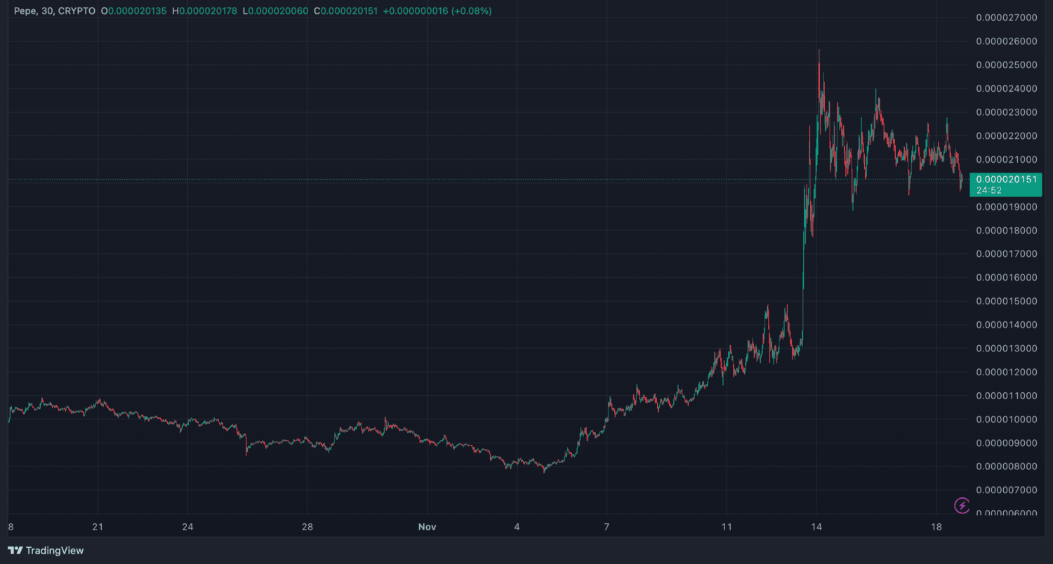 PEPE je nový memecoin spustený na Ethereu, inšpirovaný internetovým mémom Pepe the Frog, ktorý vytvoril Matt Furie na začiatku roku 2000. S cieľom pripojiť sa k populárnym kryptomenám založeným na mémoch ako Dogecoin a Shiba Inu, PEPE prijíma svoje mémové korene s politikou bez daní a priamočiarym prístupom. Netvrdí, že ponúka nejakú užitočnosť, udržiava veci čisté a jednoduché ako memecoin. Na konci apríla až v máji 2023 zaznamenal PEPE explozívny nárast, pričom jeho trhová kapitalizácia dosiahla maximum 1,6 miliardy dolárov. Prví držitelia sa cez noc stali milionármi a okolo neho sa zhromaždila silná komunita nadšencov. Tento nárast vyvolal to, čo niektorí nazývajú „sezónou memecoinov“, pričom iné meme coiny zaznamenali divoké cenové výkyvy.