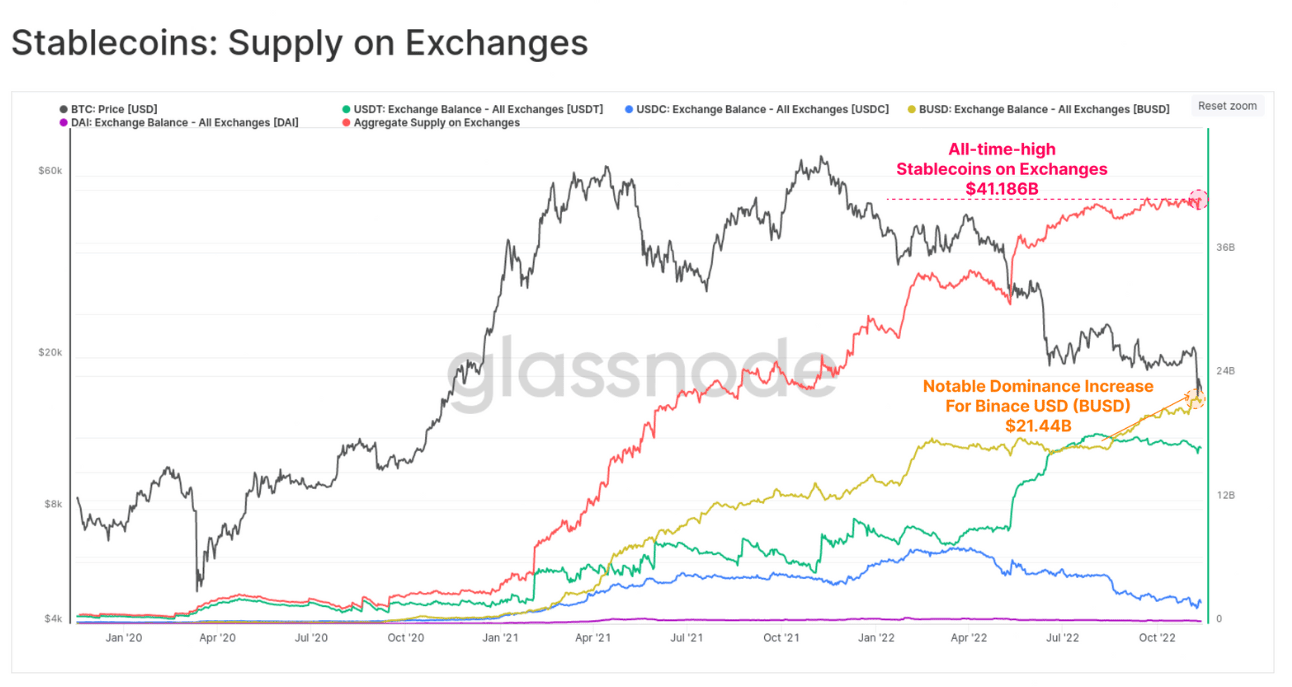 Zatiaľ čo bitcoinové a ethereové rezervy na burzách prudko klesajú, príliv stablecoinov zaznamenal vysoký krátkodobý nárast. Dňa 10. novembra čistý príliv stablecoinov zaznamenal 7. najväčšiu hodnotu v histórii ich existencie, pričom na burzy prišlo 1,04 miliardy dolárov v USDT, USDC, BUSD a DAI.