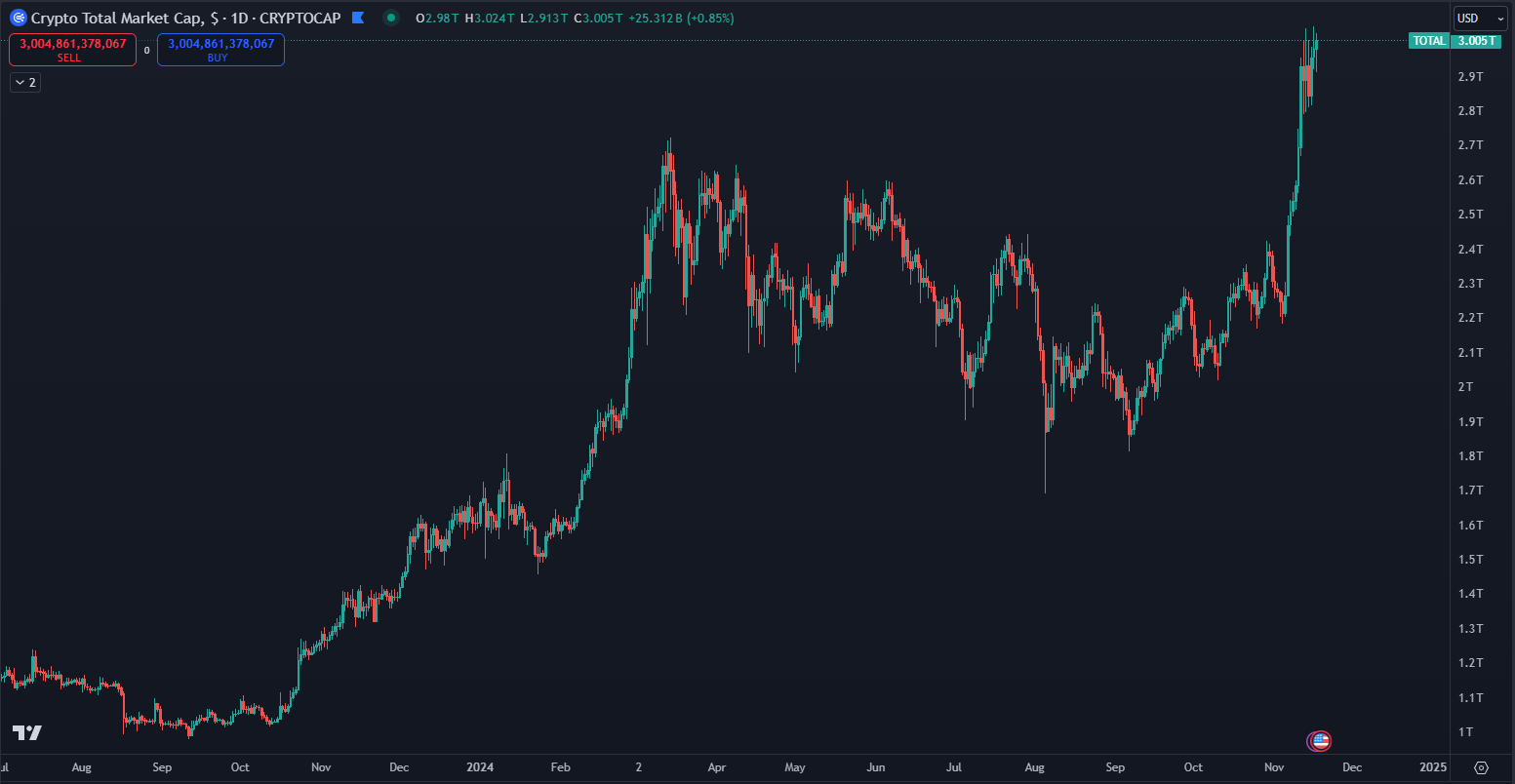 Kryptomeny prelomili kapitalizáciu 3 biliónov dolárov. Zdroj. TradingView