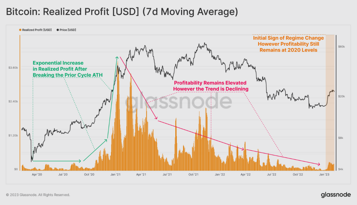 Metrika realizovaných profitov zahŕňa všetkých držiteľov mincí, ktorí predávali BTC v zisku. Tieto zisky spočíta do jednej hodnoty, ktorú môžeme vidieť na oranžovom stĺpcovom grafe nižšie. Je vypočítaná na základe 7-dňového kĺzavého priemeru a v súčasnosti signalizuje obrat dlhodobého trendu.