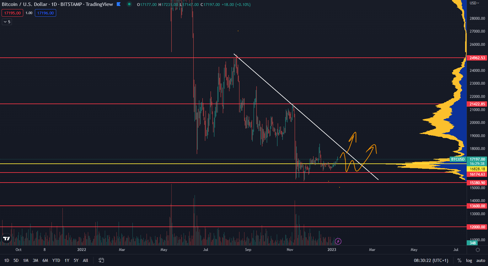 Ako vidíme na grafe nižšie, Bitcoin sa v čase písania článku obchoduje na cenovej úrovni 17 197 dolárov. Rastový potenciál je v súčasnosti pomerne slušný a cena bude čeliť iba jednej významnej rezistencii na hladine 18 100 dolárov. Na tejto zóne sa nachádza predošlé maximum a klesajúca rezistencia z maxím korekcie.