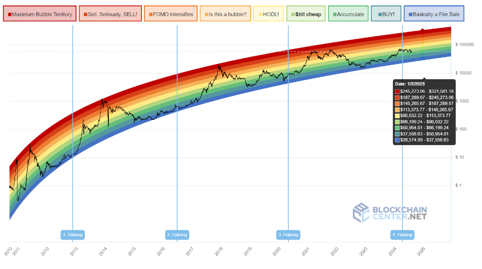 - Bitcoin podľa dúhového grafu môže v roku 2025 vytvoriť vrchol cyklu.