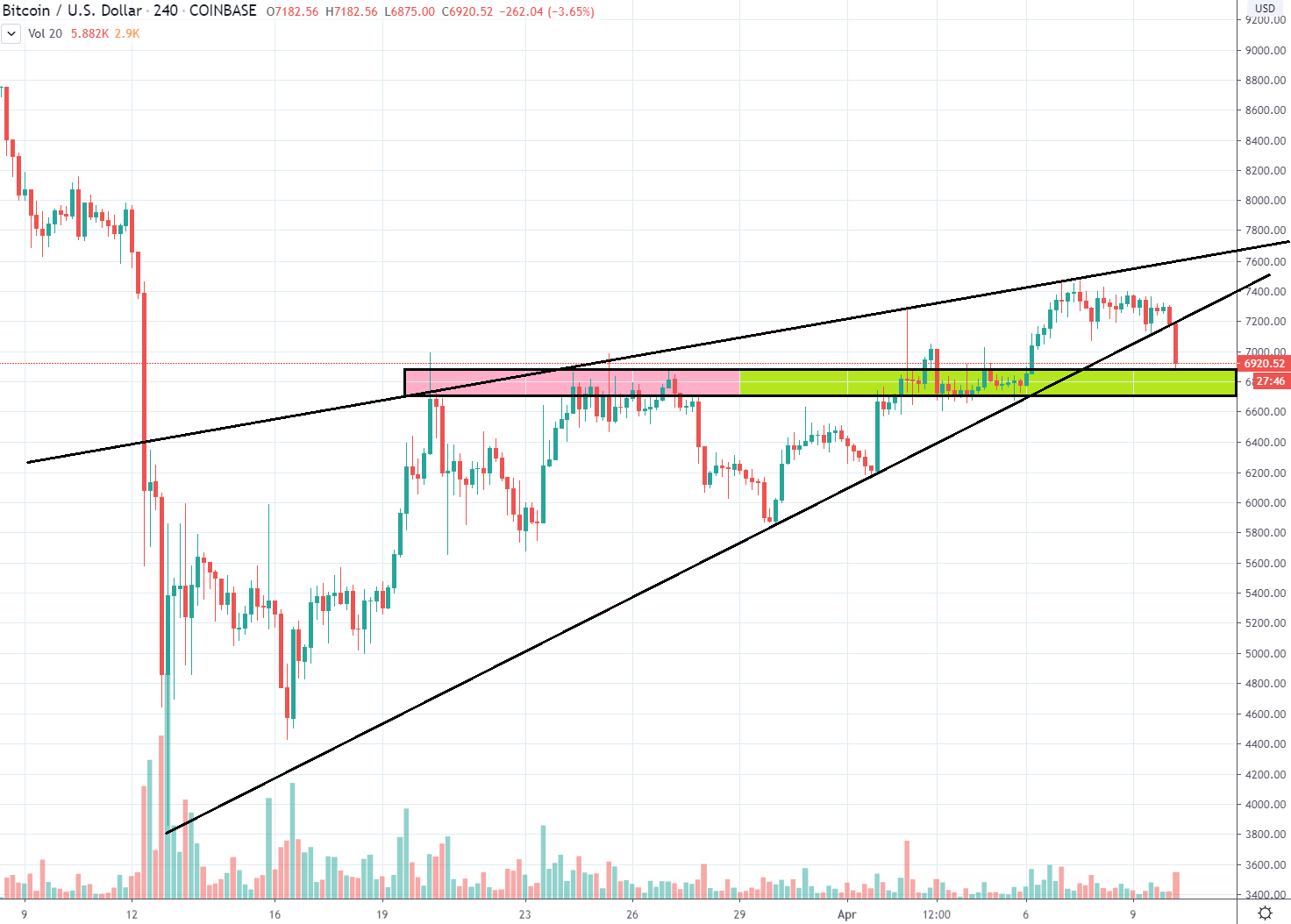 Nachádzame sa na supporte, ktorý nás niekoľkokrát podržal na začiatku apríla. V cenovom rozsahu 6900 – 6700 $ je obrovské množstvo likvidity a aby ju Bitcoin prerazil, medvede budú musieť nazbierať poriadne momentum.
