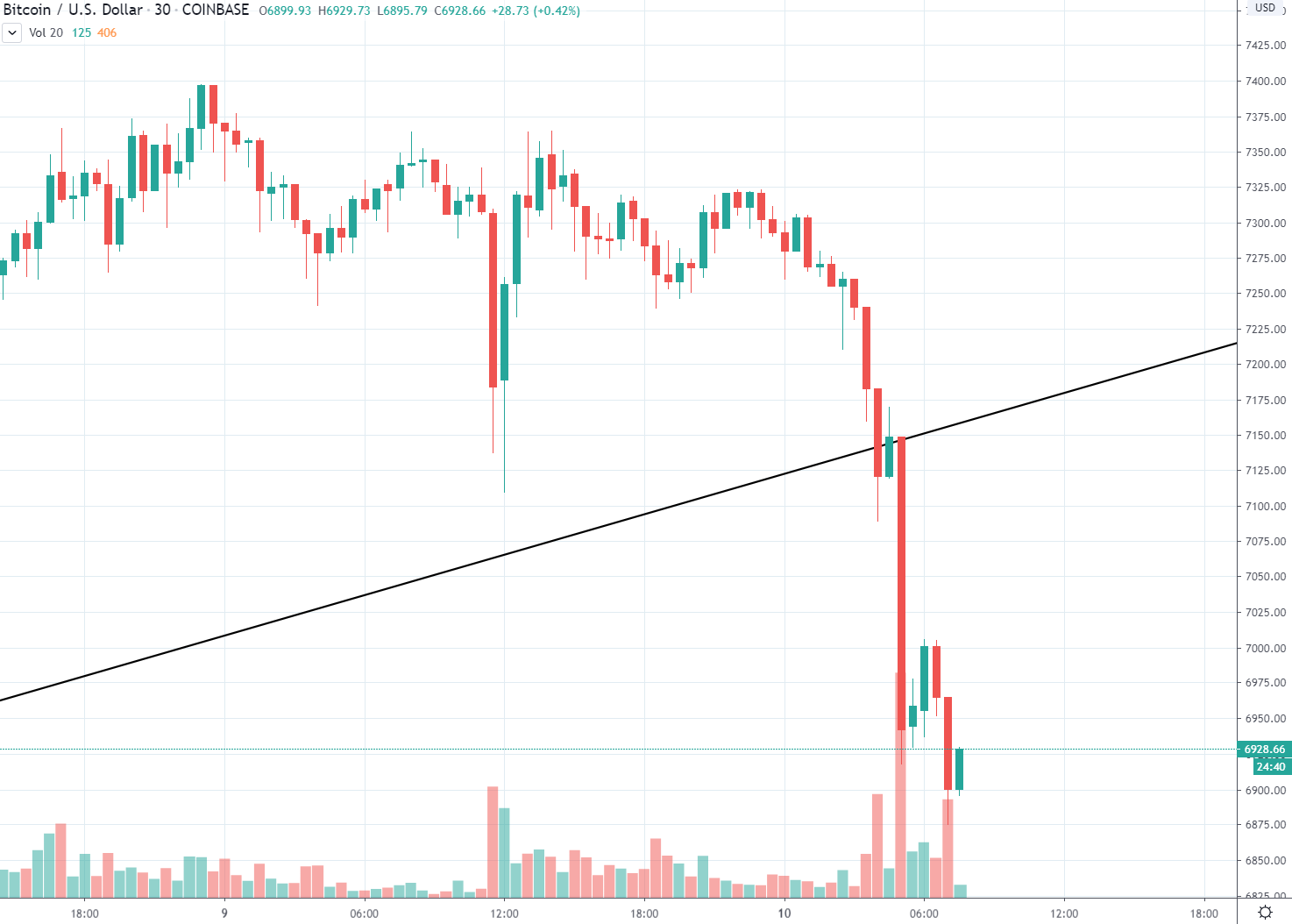 Bitcoin pred dvoma hodinami prerazil support formácie klesajúci klin, ktorú na grafe sledujeme už nejaký ten piatok. Behom jednej hodiny potom klesol o takmer 300 $. Stále však nie sme v suchu. Aktuálne low registrujeme na cene 6875 $, no tlak medveďov je stále badateľný.