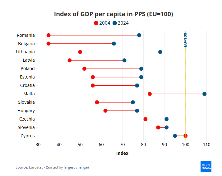 HDP na obyvateľa je v prepočte na paritu kúpnej sily (PPS) v Európskej únii indexovaný na hodnotu 100. V roku 2004 mali Rumunsko a Bulharsko najnižší index – len 35, čo znamenalo, že ich kúpna sila bola o 65 % nižšia než priemer EÚ. O dvadsať rokov neskôr sa situácia výrazne zlepšila. Rumunsko sa dostalo na hodnotu 78 a Bulharsko na 66, čo potvrdzuje rýchly hospodársky rast. Slovensko sa pre porovnanie vyšplhalo z hodnoty 58 na súčasných 75.