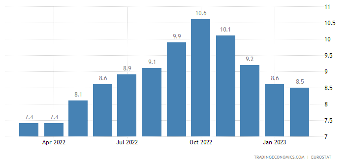 Ako vidíme na grafe nižšie, úroveň inflácie v eurozóne podľa Tradingeconomics ustupuje už niekoľko mesiacov po sebe. Od októbrového maxima sme sa dostali v súčasnosti o 2,1 % nižšie, no v medziročnom porovnaní dosahuje inflácia stále nárast. Navyše, súčasnú hladinu 8,50 % stále nemôžeme považovať za prijateľnú.