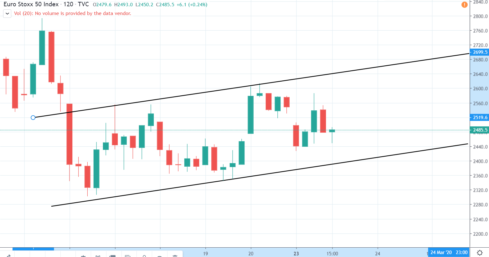 To sa zatiaľ na číslach veľmi neprejavilo. Európsky index Stoxx 50 už z historického maxima (3865 bodov) padol o 34% na súčasných 2485 bodov.Americké indexy už padli o 37%. Európa však narozdiel od Ameriky už týždeň akumuluje v akomsi stúpajúcom kanáli, ako môžete vidieť na 2h grafe.